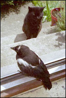 Left: death-wish magpie fledgling stares down Allen Ginsberg the cat back in 2001.